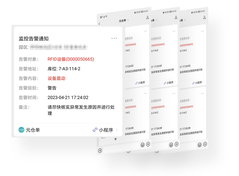 丰富的告警规则,灵活的告警方式,微信公众号实时推送,货主,平台,质权人,保险,保管人等所有参与方都能实时了解货物异常。